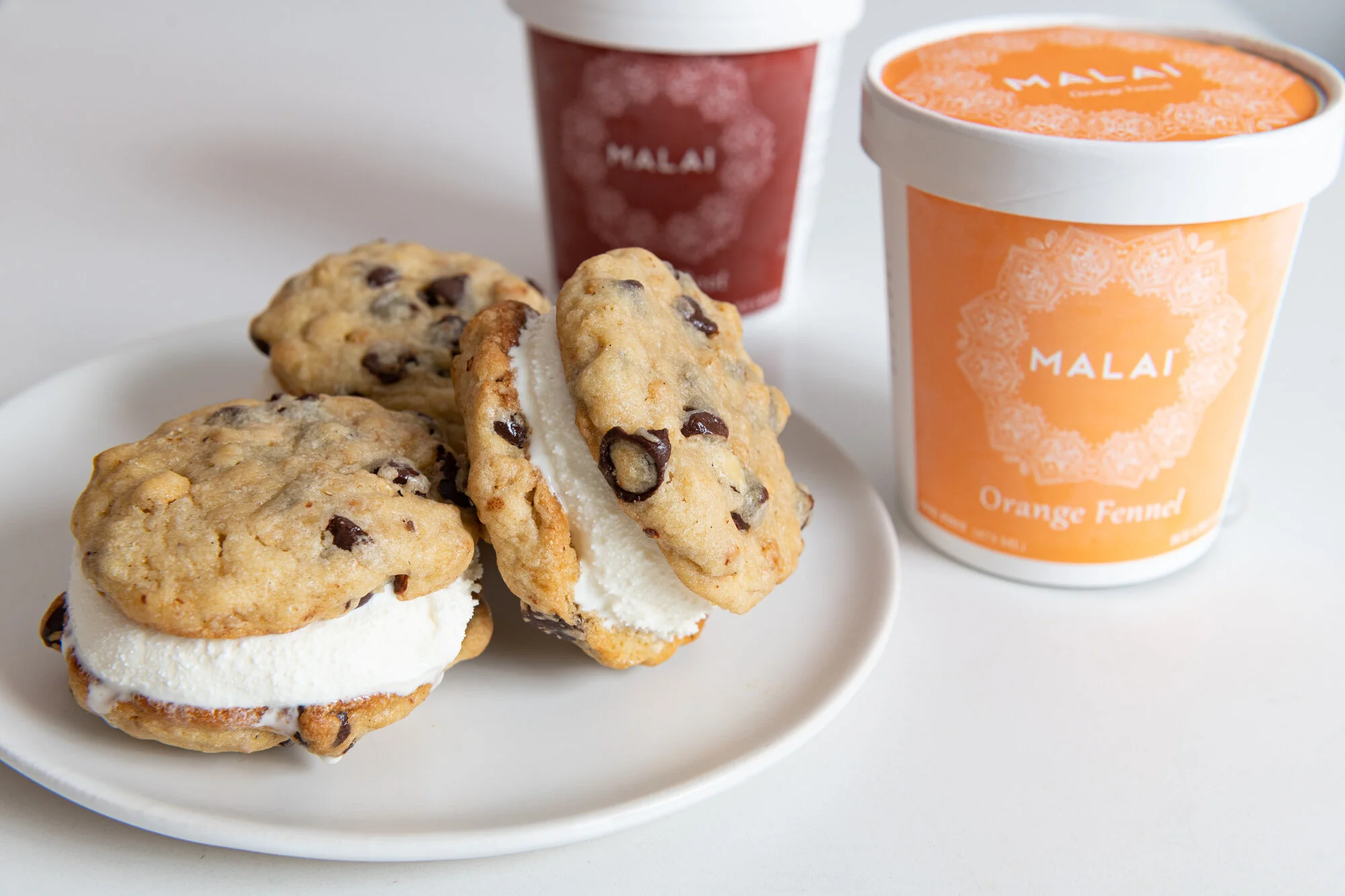 To make ice cream sandwiches, place cookies into the freezer for about 30 minutes. After the 30 minutes, remove cookies and ice cream from freezer. Scoop Malai Orange Fennel or Malai Ginger Root ice cream directly on to the center of the cookie. Gently press down with a second cookie until the ice cream spreads to the edge of the cookie. Eat immediately, or wrap tightly with plastic wrap until ready to Serve.